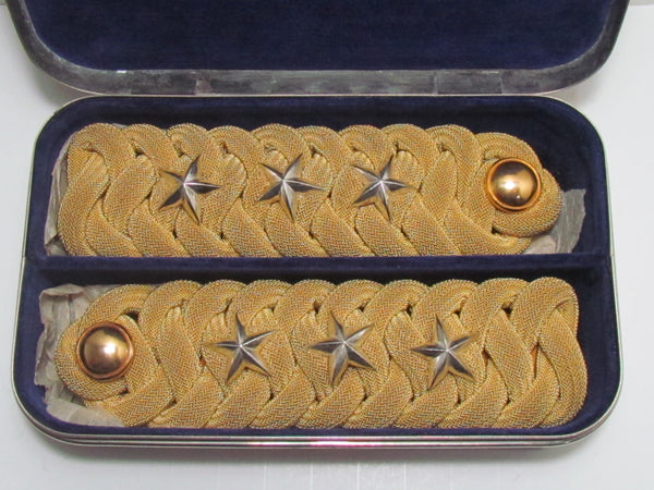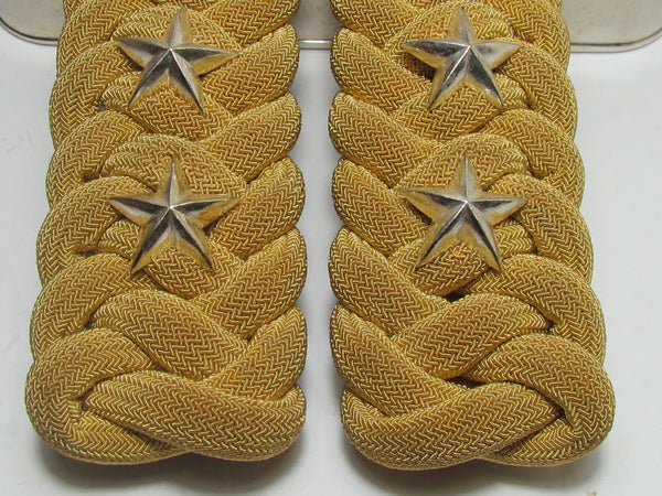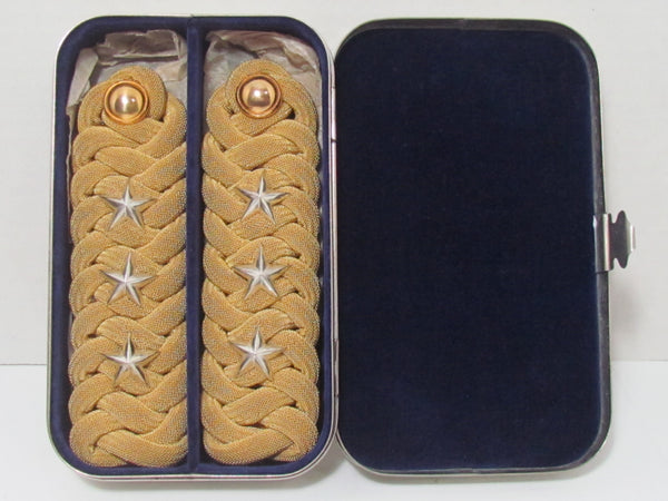 100% ORIGINAL & AUTHENTIC. EXCELLENT CONDITION SET OF WW2 IMPERIAL JAPANESE ARMY WOVEN GOLD BULLION CAPTAIN SHOULDER BOARDS (EPAULETTES), IN THE ORIGINAL METAL CASE. A CAPTAIN IN THE IMPERIAL JAPANESE ARMY WAS CALLED A 'RIKUGUN-TAII' IN JAPANESE. A FANTASTIC ADDITION TO YOUR COLLECTION.